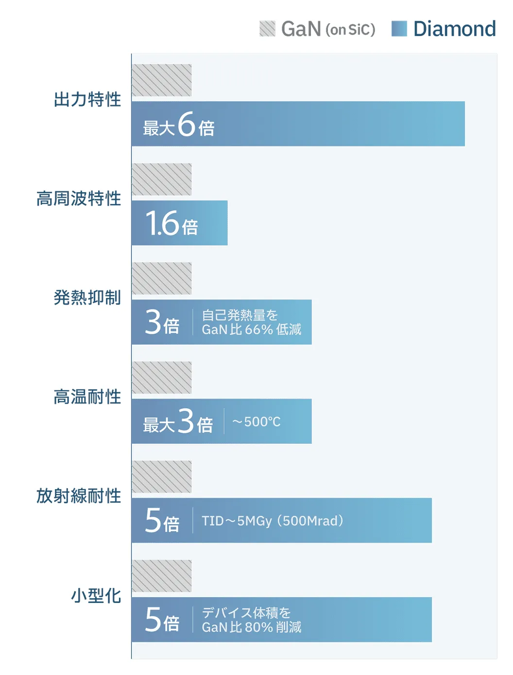 とりわけ近年導入が進むGaN(窒化ガリウム)と比較して、出力は最大6倍、自己発熱量を66%低減し、更に80%以上の小型化が可能なポテンシャルを有しています。