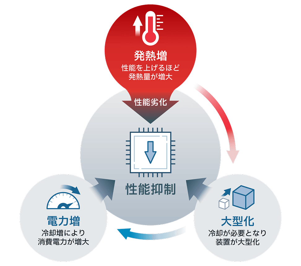 一方、それらのデジタル技術と現実世界とを繋ぐアナログ半導体は、性能の進化を求めるほどに酷使され、発熱量が増大します。そして熱が増えるほどに冷却機構が必要となり、装置全体のサイズや電力消費が膨らみ、本来目指していた製品仕様とは合致しなくなります。結果、性能を上げようとするほど性能を抑えざるを得ないというジレンマが生まれ、これが従来のアナログ半導体の限界となっています。